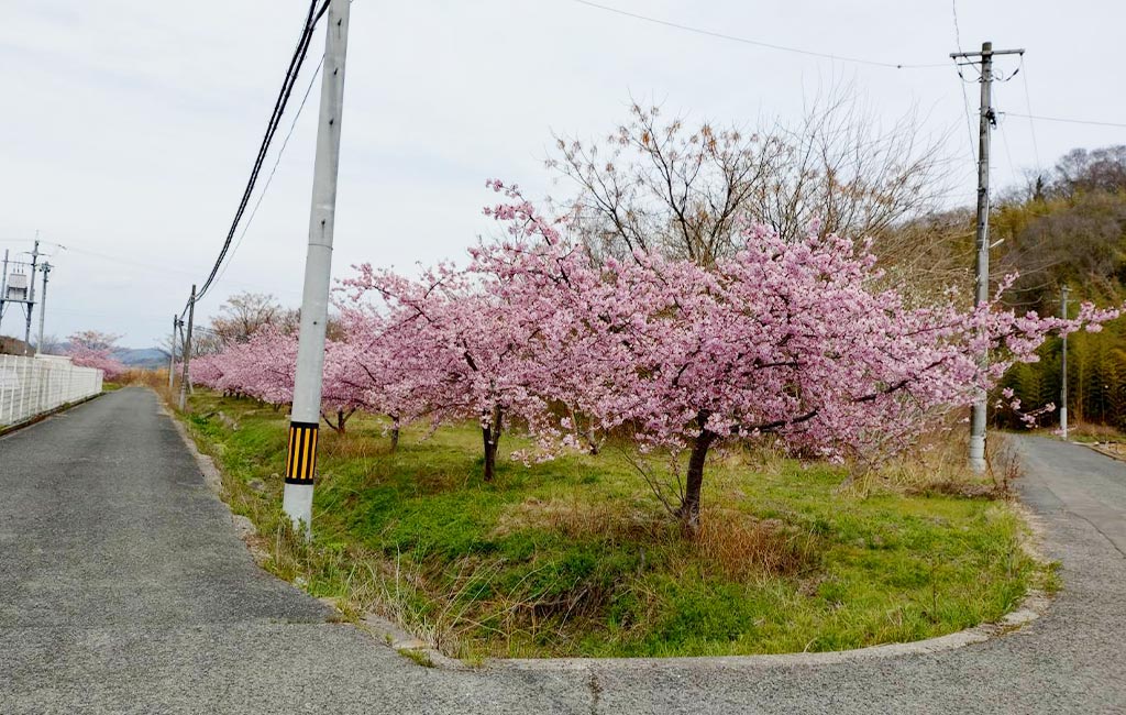 島の道沿いに続く河津桜。青空との対比が鮮やかです。